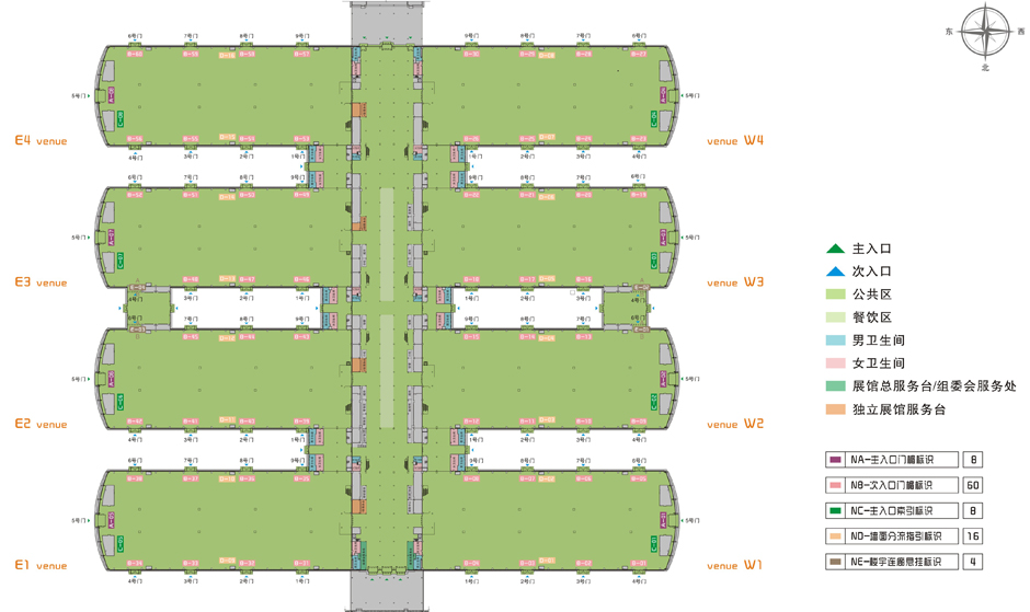 展館按照國際專業(yè)化水準(zhǔn)設(shè)計(jì),主體結(jié)構(gòu)由8個(gè)單層、無柱、大跨度獨(dú)立展廳組成,每廳面積1.32萬平方米,可設(shè)625個(gè)國際標(biāo)準(zhǔn)展位。中間由雙層連廊銜接,總體可容納5000個(gè)國際標(biāo)準(zhǔn)展位。東、南、西、北面均設(shè)有觀眾登錄廳。北廣場可舉行開幕式、慶典及大型公益活動(dòng)。